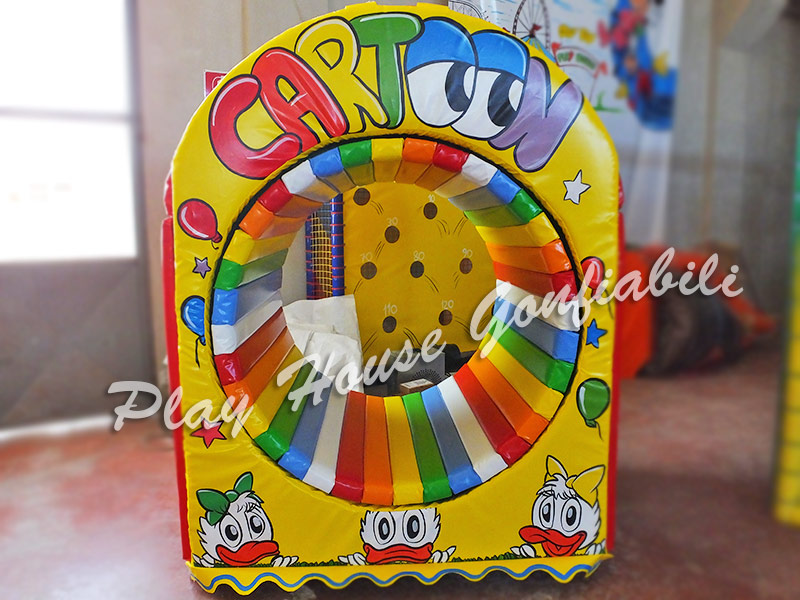 Realizzato con struttura in ferro zincato e legno, rivestimenti in eva, gommapiuma e pvc ignifugo multicolor scenografie dipinte a mano con colori atossici indelebili