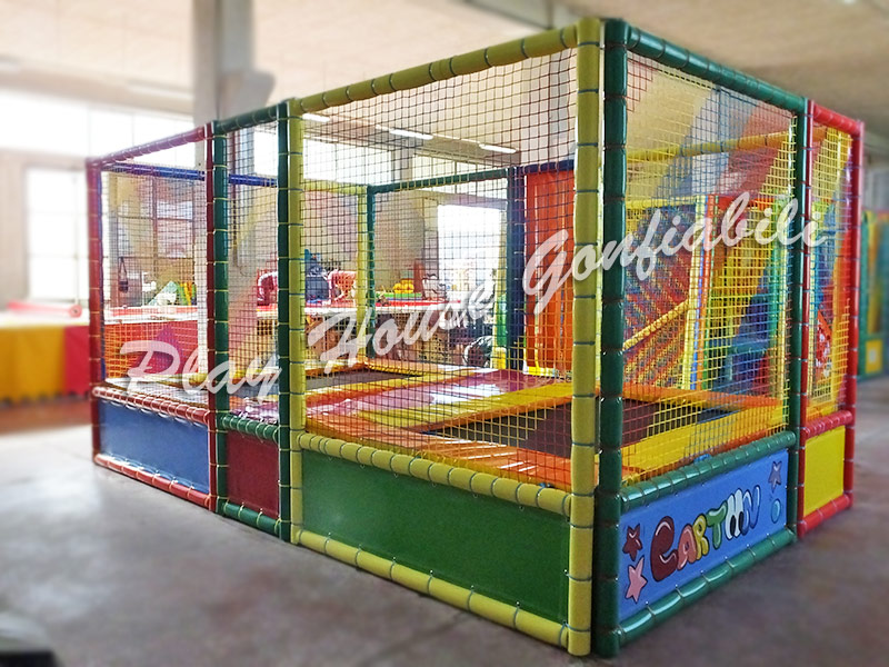 Struttura a pannelli componibili in ferro zincato rivestiti in NOMATEC, fascette antigraffio a scomparsa e rete a maglie multicolor