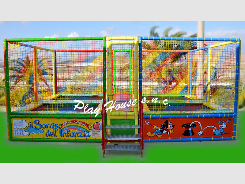 Tripla rete da salto - molle in acciaio - cuscini di protezione in gommapiuma rivestita in pvc ignifugo.